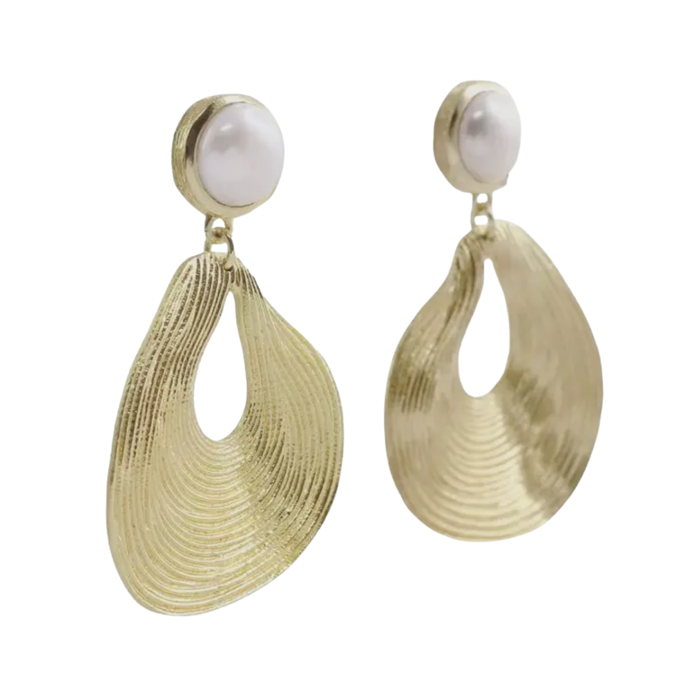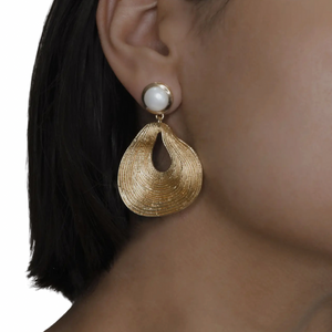 These elegant earrings are handmade in Brazil and 18k gold plated, featuring a refined pearl stone post. Enhance any outfit with their sophisticated charm! They offer a perfect blend of timeless elegance and contemporary style.