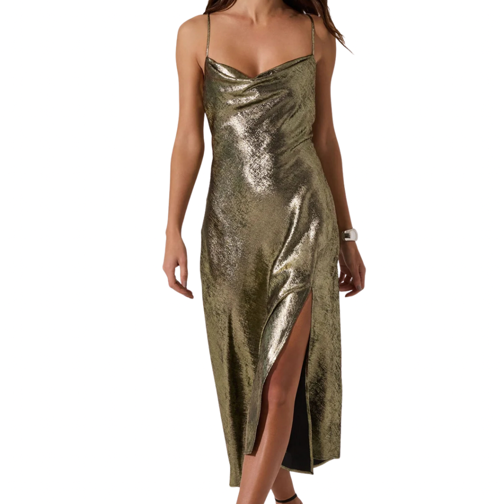 Turn heads in the ASTR Metallic Midi Dress — a luminous, figure-flattering silhouette that shimmers with every step.