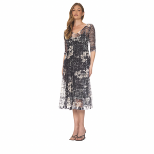 This Komarov dress brings a refined, elevated look perfect for special occasions—think cocktail hours, wedding guest events, mother-of-the-bride, or a polished evening out. The lace overlay brings feminine detail, while the hand-pleating gives it a subtle sculptural quality and dynamic movement. The 3/4 sleeves offer just the right coverage for transitional seasons (great for fall events at your store !) and the pull-on fit makes it accessible for many customers. The contrast of the dark “Ebony Spray” print against the light lace base gives it a modern twist on classic black-and-white while remaining elegantly wearable.