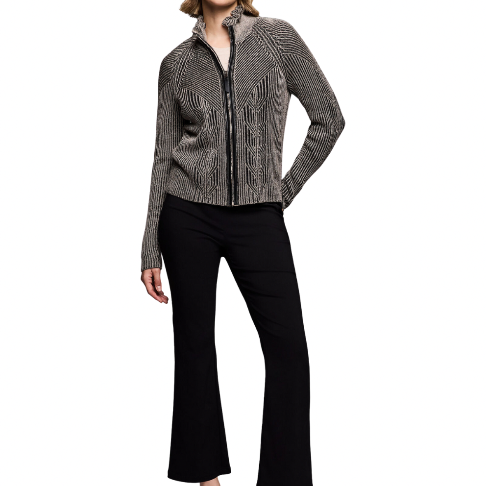 Knit in fashioning and placed cabling creates a vivid, dynamic look (and texture) while the ruffle texture at the neck adds a dose of femininity: just the thing to stand out from the rest of the zipped layer crowd.